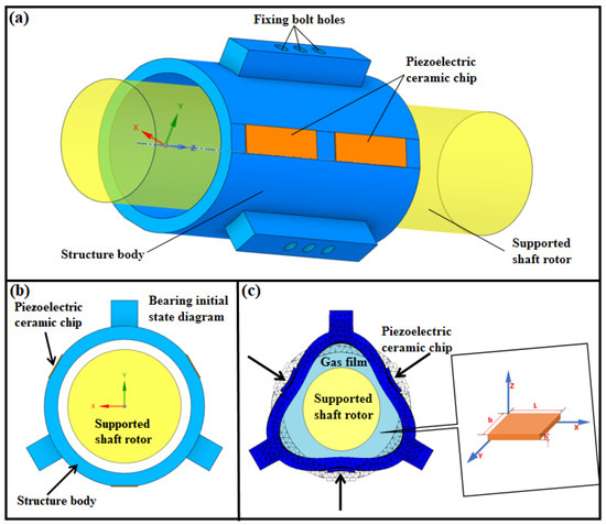 As a novel type of non-contact bearing reliant on the gas pressure film lubrication effect produced by the vibration squeeze [29] to bear load, the gas-extruded membrane bearing shows diversity in structure. In this paper, a piezoelectric-driven radially inclusive gas extrusion membrane bearing is developed, as shown in Figure 1. The body of this bearing is a cylindrical shell, and the suspended object is a cylindrical rotor. The shell is circumferentially distributed with three axial ribs spaced at 120°, and the ribs divide the whole shell into three vibration regions, each of which is pasted with a piezoelectric ceramic sheet, as shown in Figure 1a,b.