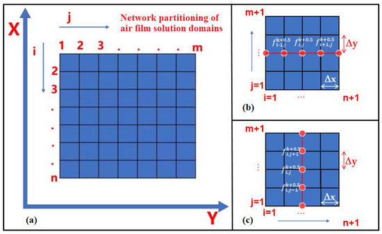 The finite difference method is purposed to discretize the differential equation in the computational domain and express the differential term of the equation by means of difference approximation, with the equation transformed into an algebraic equation to find the solution. There are both explicit and implicit difference schemes. The explicit difference scheme applies strict restrictions on the selection of time step, and it is difficult to converge for the calculation of stability difference. Although the implicit difference takes a more complex form than the explicit difference, it performs better in computational accuracy and stability. In this paper, an unconditional stable alternating direction implicit method is used to discretely solve the Reynolds equation. The gas film solution domain in Figure 1c is divided into a certain number of grids, as shown in Figure 2a.