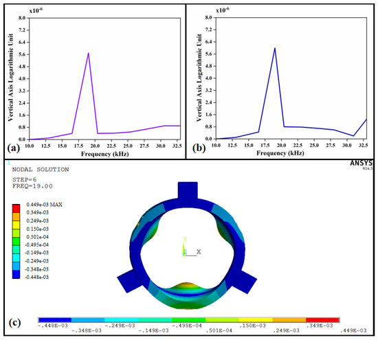 It can be seen from the curve that the amplitude reaches its maximum at the center of the bearing cylinder wall given the excitation frequency of 19 kHz, and the vibration displacement along the x and y directions is basically identical. Figure 4c shows the dynamic deformation cloud diagram of the extracted frequency of 19 kHz in the modal analysis. Considering the working principle of the gas-extruded membrane bearing, it can be found that the gas-extruded membrane bearing in the rectangular piezoelectric ceramic sheet is in the direction of expansion and contraction of the vibration mode of extrusion and the shaft gap in the formation of air extrusion lubrication gas film. That is to say, for the structure at a frequency of 19 kHz, the bearing in the axial direction of the overall bending, and the radial “triangle” symmetrical contraction, the vibration of the bearing ends of the deformation is supposed to be radial uniform contraction to prevent the overflow of air in the gap. The bearing at the resonant frequency of 19 kHz meets the requirements on the vibration of the bearing for the formation of its extruded air film.