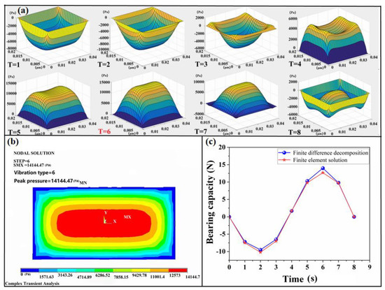 (a) Instantaneous distribution of pressure at each node of the alternating implicit difference method; (b) finite element method T = 6 pressure instantaneous distributions; (c) comparison of bearing capacity values between the two methods in one cycle.