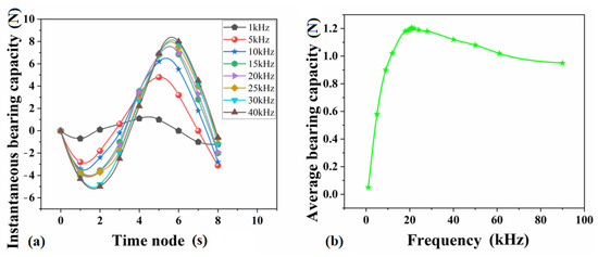 When a = 5 μm and H0 = 50 μm, the instantaneous load-bearing capacity of air film during vibration frequency is 0–40 kHz, respectively. The effect of vibration frequency f on the load-bearing capacity is shown in Figure 6, and from the figure can be seen that the instantaneous load-bearing capacity of the air film within one cycle is small when the vibration frequency is low, and the load-bearing capacity of the extruded film is limited at this time. As the vibration frequency rises, the difference between the positive and negative instantaneous load-bearing capacity increases, and the peak positive load-bearing capacity in one cycle is obviously larger than the peak negative load-bearing capacity. At this time, the gas squeeze film effect is obvious, and a strong bearing effect is produced to achieve the stable suspension of the load. By calculating the average load-bearing capacity in cycles at different vibration frequencies as shown in Figure 6a, the relationship between the average load-bearing capacity and vibration frequency is determined, as shown in Figure 6b.