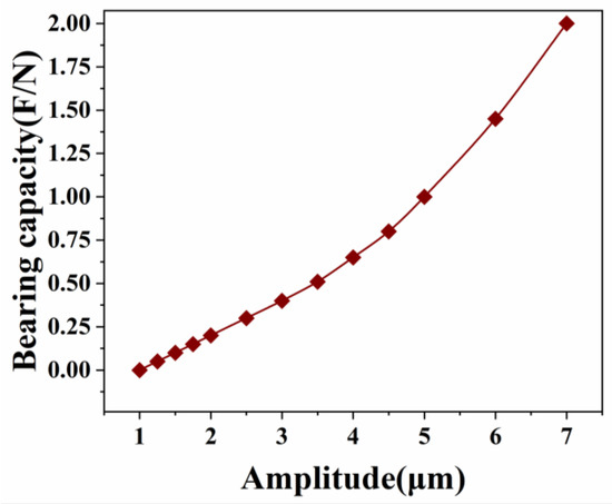 When H0 = 50 μm, the effect of amplitude change on the average load-bearing capacity and cut-off frequency is investigated, and the instantaneous load-bearing capacity of the air film is calculated for a period during which the amplitude ranges from 0 to 7μm. The results are further analyzed to find out the law of how increasing amplitude affects the average load-bearing capacity, as shown in Figure 7. From the figure, it can be seen that given a certain thickness of the film, the larger the amplitude of the bearing extrusion motion is, the higher the extrusion efficiency of the film and the more significant the extrusion effect are. Thus, the average load-bearing capacity of the film also improves.
