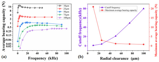 (a) The load-bearing capacity with different radial clearances; (b) the impact of radial clearance change on both cut-off frequency and load-bearing capacity.