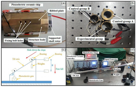 Based on the assumption that the shaft is stationary when the bearing functions, it is difficult to determine whether the bearing is completely separated from the shaft surface due to the small thickness of the air film produced using the prototype generally at the micrometer level. As a result, it is a challenge to accurately measure the maximum force of radial levitation in the bearing. For this reason, a force measurement experimental bench was developed to indirectly measure the bearing force by observing and measuring the state of friction between the bearing and the inclined surface. During the experiment, the angle between the tilting axis and the horizontal plane was adjusted constantly. When the positive pressure applied by the bearing on the tilting axis is equal in magnitude and opposite in direction to the levitation force, it can be considered that the bearing achieves frictionless levitation. In this case, the acceleration of the sliding bearing is approximately equal to the acceleration of gravity. The downward acceleration of the bearing can be measured with a photoelectric timer, the mass of the bearing and the magnitude of load can be measured with precision balance, and the positive pressure applied by the bearing on the tilting axis can be calculated with the gravity of the bearing and load, as well as the angle between the tilting axis and the horizontal plane. The principle of conducting measurements on the test bench is shown in Figure 9c. During the experiment, the bearing cylinder is first allowed free fall with a vertical distance of H*, and a measurement is performed to determine the instantaneous velocity v1 of the bearing cylinder falling to the position of H*. Then, with the cylinder mounted on the tilting axis, a photoelectric gate is placed under the tilting axis to measure the instantaneous velocity of the cylinder passing through the photoelectric gate. The release position of the cylinder and the position of the photogate are adjusted to ensure that the cylinder slides down the tilt axis at a vertical height of H*. With the sleeve released from rest, the instantaneous velocity v2 of the bearing cylinder is measured as it slides down to the H* position, thus determining if v1v2 holds. If not, the inclination angle of the tilting axis θ* is constantly changed. The above process is repeated until v1v2 holds. At this time, it can be considered that the movement of the cylinder conforms to the conservation of mechanical energy. That is to say, there is no contact friction arising between the cylinder and the shaft cylindrical surfaces, which implies that the pressure exerted by the extrusion membrane can be induced by the bearing cylinder in the radial direction of the axial levitation up. The weight of the vibrator and the tilt angle θ* are known. According to the results of force analysis, it is perpendicular to the axis of gravity component—that is, the air membrane bearing force FN. According to the principle followed through the bearing force measurement, we build a force test bench as shown in Figure 9d: