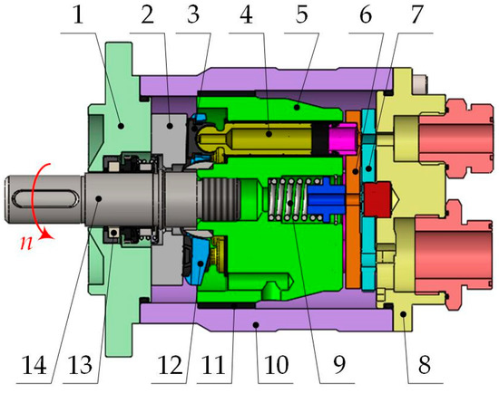 Structure of the water hydraulic axial piston pump: 1—pump front cover, 2—swash plate, 3—slipper, 4—piston, 5—cylinder block, 6—thrust plate, 7—port plate, 8—pump rear cover, 9—spring, 10—pump shell, 11—sliding bearing, 12—return plate, 13—shaft seal, 14—drive shaft.