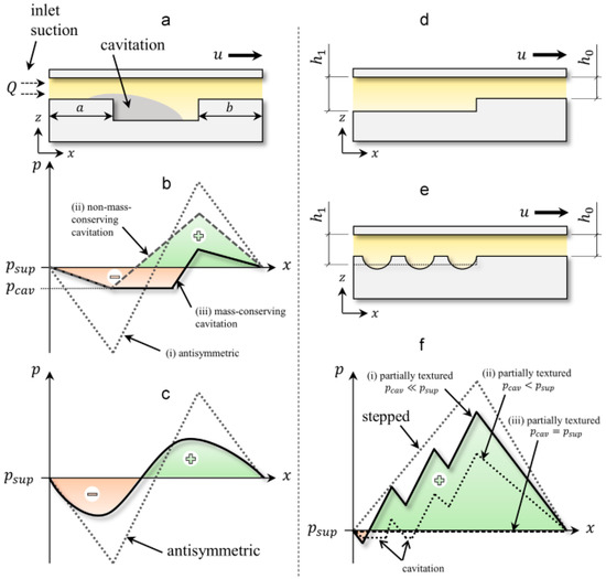 Mechanism of the hydrodynamic effect and cavitation effect of the surface texture under the fluid lubrication condition [71]: (a) single texture cell; (b) typical pressure distribution over a single texture with cavitation; (c) typical pressure distribution over a single texture with inertia effects; (d) stepped slider; (e) partially textured slider; (f) typical pressure distributions over a stepped and partially textured slider.