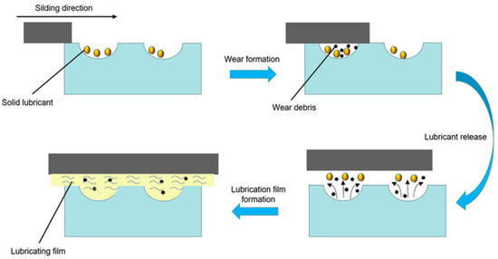 In the boundary lubrication state, the lubrication mechanism mainly manifests as a secondary lubrication effect. The schematic diagram is illustrated in Figure 7 [64]. A surface texture of any shape can always form a concave space that can store more lubricant than a smooth surface [70,76,77]. As the friction process progresses, the lubricant between the friction surfaces decreases gradually, due to the friction contact, and the friction coefficient and surface temperature both rise. The resulting thermal expansion effect releases the solid lubricant stored in the concave space in the textured surface, and the polar molecules adsorbed on the friction surface form a boundary lubrication film with different properties from the lubricating medium, which effectively prevents direct contact between the friction surfaces, and achieves secondary lubrication [70,76,78].
