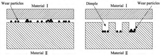 In the dry friction state, the main lubrication mechanism is the storage of wear debris. With the relative movement of the friction pairs, wear debris is produced, and forms furrows on the contact surface, damaging the surface topography [79]. The working mechanism of the surface texture mainly includes the storage and containment of grinding particles and grinding chips. The secondary wear on the matrix, caused by high friction and wear due to the furrowing effect, can be reduced [80], as shown in Figure 8.