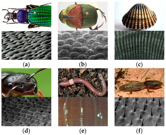 The surface structure of natural organisms: (a) Stenocara; (b) dung beetle; (c) shell; (d) ant; (e) earthworm; (f) mole cricket.