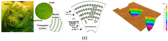 The shape categories of surface micro-texture include pits, convex bodies, grooves, and scales. Inspired by the microscopic appearance of the body surface of the natural organisms in Figure 10, the specimens with surfaces of hemispherical, elliptical, and triangular pits are processed, and tested for their tribological properties [92,93,94,95]. Based on the body surface of organisms, scholars have associated and designed some optimized and non-traditional micro-pits with different textures [96,97,98], shown in Figure 11. At the same time, it has been found that the combination of pits and grooves could also improve the effect of friction reduction and resistance, utilizing the texture morphology of the shell surface [99,100,101].