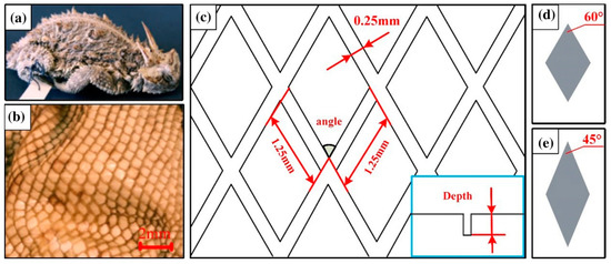 Scale micro–nano structure of the Phrynosoma cornutum epidermis [104]: (a) Phrynosoma cornutum; (b) the ventral scale structure; (c) schematic diagram of the bionic rhombic texture; (d) the rhombic textures of 60°; (e) the rhombic textures of 45°.