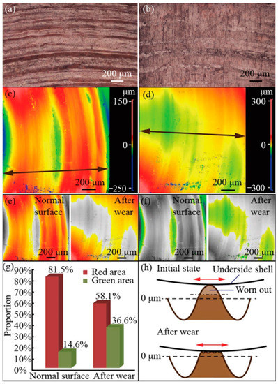 Tribological mechanism of water snails [109]: (a) morphology of the operculum of a fresh snail specimen; (b) morphology of the wear traces of the operculum after the dry friction experiment; (c) surficial topography of the operculum before the dry friction experiment; (d) surficial topography of the operculum after the dry friction experiment; (e) extraction of the red area (0 μm–25 μm) before and after the dry friction experiment; (f) extraction of the green area (−5 μm–−25 μm) before and after the dry friction experiment; (g) bar graph of the proportion of red and green area before and after dry friction; (h) schematic illustration of the wear caused by dry friction for one micro-ridge.