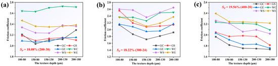 Some studies have found that the diameter of the pit is not linearly related to the friction coefficient and the hydrodynamic pressure. As shown in Figure 18 [119], there is a critical value for the contact width. If the diameter is greater than or less than the contact width, the lubricant film thickness and the bearing capacity will change significantly [120,121,122]. A pit diameter which is equal to, or less than, the contact width will reduce the friction coefficient, while the pit diameter which is much larger than the contact width will increase the friction coefficient. This contradicts the experimental data of Sun [119] mentioned before. We believe that it is because the sample point selection methods of the two are different, and the number of samples is different. The selected sample diameter of Sun’s study [119] was much larger than the contact width, resulting in a linear correlation.