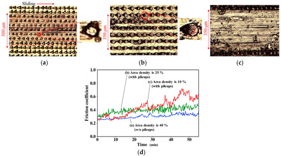 - Shimizu, J.; Nakayama, T.; Watanabe, K.; Yamamoto, T.; Onuki, T.; Ojima, H.; Zhou, L. Friction characteristics of mechanically microtextured metal surface in dry sliding. Tribol. Int. 2020, 149, 105634. [Google Scholar] [CrossRef]
