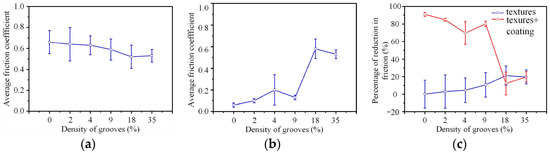 It should be emphasized that different motion modes and directions also lead to different friction properties. Texture can be constructed on the coating by combining DLC and laser technology. The groove texture is created using this method. When the groove is orientated along the sliding direction, it is similar to the larger texture, and the friction wear rate is higher. However, when it is perpendicular to the sliding direction, the friction and wear properties are good [125,126].