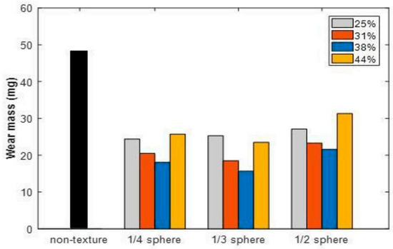The research shows that the friction process is mainly divided into two stages. In the early stage of running-in, the friction coefficient fluctuates obviously. In the second stage, the texture pattern and the smooth pattern are stable. As shown in Figure 17, the experimental data of Sun [119] show that the wear volume in the first stage accounts for about 60% of the total friction process, and the wear amount in the steady friction process in the later stage of the running-in is less. The surface texture with a relatively small diameter may improve the friction performance.