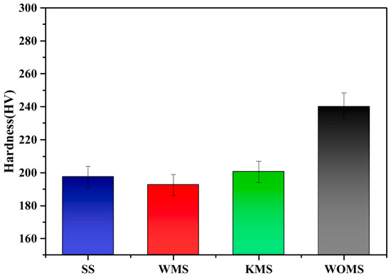 Table 1 shows the comparison of corrosion, wear, and interaction in different metallic materials. Austenitic stainless steel (316L) can improve chloride ion corrosion resistance, and is more suitable for moving parts in corrosive seawater environments than martensitic stainless steel (304). Compared with single austenitic stainless steel, ferrite and austenitic duplex steel (2205) can further improve the corrosion resistance of parts, and prolong the service life in corrosive media. Titanium alloy (Ti6Al4V) has better wear and corrosion resistance. However, the corrosion-accelerated wear of titanium alloy is about 37% of the total material loss, indicating that corrosion is the key factor leading to the total wear damage of titanium alloy. The pure mechanical wear rate of aluminum alloy (2024) is approximately 98.1–80.2%, which is significantly higher than that of stainless steel and titanium alloy, and becomes the key factor leading to abrasion failure in aluminum alloy. Therefore, improving the wear resistance of the aluminum alloy is the primary problem faced when applying it to moving parts in a corrosive medium. Compared to stainless steel and titanium, nickel alloy (Monel K500) performs well in terms of both mechanical properties and corrosion resistance, making it more suitable for moving parts in harsh corrosive environments.