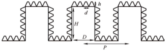 - Wang, H.T.; Zhu, H. Effect of cylindrical micro-pit’s distribution form on tribology properties of textured surface. Tribology 2014, 34, 414–419. (In Chinese) [Google Scholar]