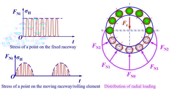 However, an increasing number of scholars are acknowledging that local plastic deformation occurs in the contact area [,,,,]. Although many tests have demonstrated that the compressive ultimate strength of materials is higher than their tensile ultimate strength, the stress level of micro-yield plastic deformation under compressive loading is somewhat lower than that under tensile loading []. Consequently, local plastic deformation is more likely to occur under compressive loading, leading to damage accumulation, material properties’ deterioration, crack initiation, and propagation until surface spalling, which ultimately results in RCF failure. Additionally, elements of bearings, such as balls, rollers, or raceways, typically experience asymmetric cyclic loading as depicted in Figure 1, which generally leads to accumulated plastic deformation known as the ratcheting phenomenon. Hence, it is more realistic to take plastic deformation into consideration when simulating the contact stress state.
