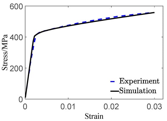 In Koo’s work [], some mechanical tests of AISI 52100 were conducted; thus, in this work, parameters in the constitutive model are obtained based on the experimental data from their work. In addition, the parameters in the elastic damage evolution rule are obtained by combining the torsional fatigue S-N curve with the integration of damage laws according to Walvekar’s work []. As for parameters in the plastic damage rule, the results from Park’s work [] were used. Therefore, all parameters in the damage-coupled constitutive model are shown in Table 1.