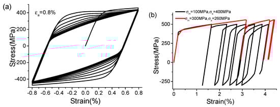 Cyclic behavior simulation of the bearing steel AISI 52100: (a) for strain-controlled condition; (b) for stress-controlled condition (ratchetting occurs).