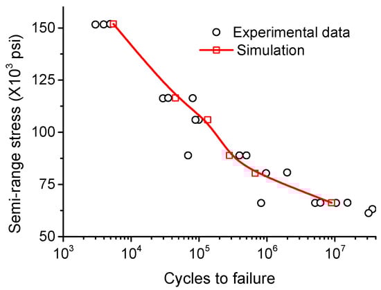 In order to assess the precision of the developed model, validation has been conducted. The adopted FE models are shown in Figure 2. Figure 3 presents the comparison between simulation and experimental results for the tensile test, which demonstrates a high level of agreement. Figure 4 illustrates the cyclic behavior of AISI 52100 under different loading conditions. As detailed cyclic testing data could not be found in the public domain, no comparison has been made. However, it is evident that asymmetrical loading leads to accumulated inelastic deformation and will facilitate fatigue failure. Figure 5 displays the experimentally obtained τa- N curve reported in ref. [], with red symbols indicating the predicted fatigue lifetime using the proposed model in this work. The results show great agreement with an acceptable discrepancy. Overall, it is highly convincing that the developed model is reliable for use in RCF analysis.