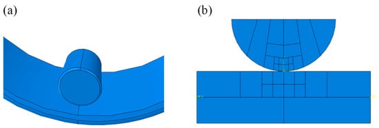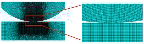 Considering the uniformity of the loading distribution along the axial direction, the aforementioned model can be simplified as a line contact. Under the assumption of plane strain condition, it could be further simplified as two deformable circles with different radii of curvature in contact with each other, which is commonly observed in roller bearings. Based on the Hertzian contact theory, this simplified model can be represented as half a circle in contact with an infinite half plane, as illustrated in Figure 6b. In this representation, the half circle represents the roller, and the half plane represents the outer ring. Consequently, as shown in Figure 7, the plane strain element CPE3 is utilized. To strike a balance between accuracy and efficiency, an element size of 12 μm is employed in the contact region, while a relatively coarser mesh is utilized away from the contact region. Since both the roller and outer ring are made of AISI-52100 steel, the elastic–plastic constitutive model described in Section 2 is implemented through user subroutine UMAT in ABAUQS. All the displacements at the bottom of the outer ring are fixed, and a constant force p is applied at the coupling reference point along the Y-axis to simulate the contact behavior.