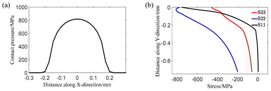 Simulation results of (a) contact pressure at the contact surface; (b) σxx, σyy and σzz at the contact center.