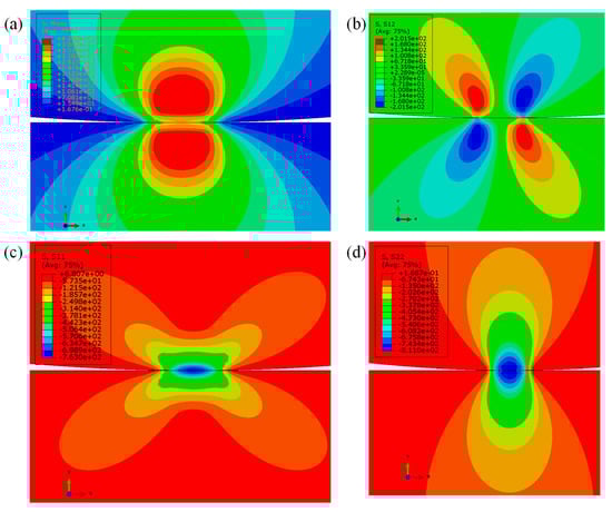 Distribution of contact stress: (a) Mises; (b) S12; (c) S11; (d) S22.