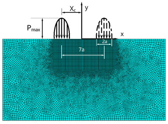 It will be implemented as a boundary condition that transverses across the contact surface during a period stipulated in FE analysis. In Equation (14), x represents the coordinate on the surface, pmax denotes the pressure at the center xc of the contact pressure distribution, and a indicates the semi-contact width.