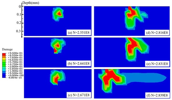Figure 12 demonstrates the development of the failure zone due to RCF damage as the number of rolling contact cycles increases. It can be observed that the first element to reach the damage threshold Dc = 0.95 is located at the subsurface, approximately at a depth of 0.1 mm, in the region of maximum Mises stress. This number of cycles, denoted as the initiation lifetime (Ni = 2.551 cycles), signifies the time point at which the crack initiates, as shown in Figure 12a. Subsequently, and increasing number of elements suffer damage accumulation. Some elements gradually reach their limit and lose their load capacity, ultimately forming the crack. Considering D ≥ 0.2 as a significant damage value, it can be observed that the damaged region expands gradually, foreshadowing the path of the crack. As illustrated in Figure 12b–e, the crack propagates towards the deep zone as well as the surface almost simultaneously. Once the crack extends to the surface, it bifurcates, with one branch perpendicular to the surface and the other parallel to the surface, as shown in Figure 12f. Furthermore, the crack generally propagates parallel to the surface more quickly and eventually forms spalling. It is consistent with the experimental observations []. In this work, it is defined that once the crack reaches the surface, spalling is considered to have occurred, resulting in failure. Therefore, the corresponding number of cycles is considered to be the total RCF lifetime. The number of cycles from the crack initiation to the occurrence of surface spalling is regarded as the crack propagation life.