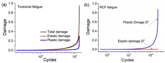 Evolution of elastic and plastic damage of two cases: (a) torsional fatigue; (b) RCF fatigue.