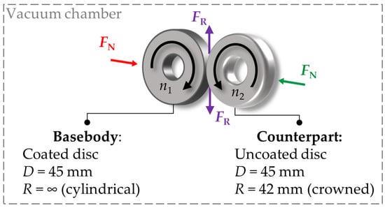 Tribological testing was executed on a two-disc tribometer (2DT, Optimol Instruments Prüftechnik GmbH, Munich, Germany) under vacuum conditions (pressure 0.2 Pa) and at room temperature (RT) with a constant slide-to-roll ratio (SRR); load was varied in two steps. In this study, the coated cylindrical discs were pressed against uncoated crowned discs (Figure 1) to simulate the contact conditions similar to rolling bearings.