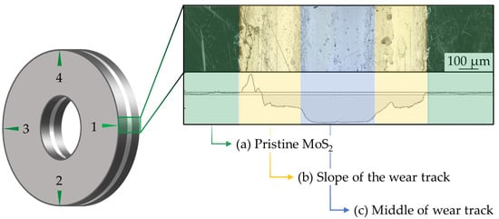 As illustrated in Figure 2, the average profile of 50 cross-section measurements was obtained at four points on each specimen, offset by 90° to each other. From the resulting surface profiles, the wear track width and depth were measured, and the wear track area with the arithmetic mean values were calculated. Based on the mean wear area and the circumference, the wear coefficient (wwear) was calculated by corresponding the wear volume (WV) to normal force (FN) and rolling distance (s), according to Archard [].