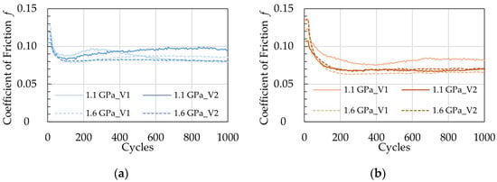 COF over the complete testing time (1000 cycles): (a) MoS2 and (b) MoS2:N, for two load cases (solid line 1.1 GPa, and dashed line 1.6 GPa). V1 and V2 represent the two test runs.
