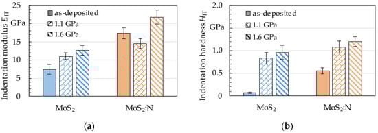 Measuring the coating thickness, the difference between the pure and the nitrogen-modified MoS2 coating was obvious, and it was noticeable that the modification corresponds to a 32.5% reduced coating thickness for an almost identical deposition time. On the one hand, it is known from previous work [,] that pure MoS2 coatings deposited by PVD under threefold substrate rotation tend to a certain degree of porosity; therefore, its presence was assumed here as well. On the other hand, the lower coating thickness of MoS2:N indicated a densification of the coating with fewer pores. For instance, Fu et al. [] and Hudec et al. [] demonstrated via scanning electron microscopy and transmission electron microscopy the reduction of pores and, thus, a densification of the MoS2-based coating by adding nitrogen. Another possible explanation was provided by Hebbar Kannur et al. []. In their study, the nitrogen modification resulted in a lower deposition rate due to a mixed nitrogen–argon plasma during the deposition process, thus possibly reducing S and Mo sputtering yields. In our study, the indentation hardness (HIT) and indentation modulus (EIT) of pure MoS2 and MoS2:N differed significantly for the as-deposited state. Hence, adding nitrogen during the deposition process caused a remarkable upsurge of 700% in HIT and 132% in EIT compared to the pure MoS2 coating (see Table 3). In turn, these observations indicated the previously suggested densification of the MoS2:N coating due to nitrogen modification. An enhancement of the mechanical properties by adding nitrogen with similar trends was reported in [,,,,].