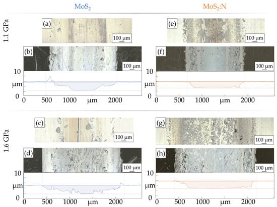 As depicted in Figure 5a–d, for all MoS2 tests, primarily the middle of the wear track showed (little) signs of coating transfer, indicated by the matching pattern on the counterpart. The same behavior was observed for MoS2:N (Figure 5e–h), with the difference of the wear track slopes of the basebody, displaying the accumulated coating alongside the movement direction (Figure 5f,h). A more detailed illustration of the transition from the middle of the wear track to the slope of the wear track is depicted in Figure 8. From these images, it was demonstrated that a steady transition for MoS2 could be found from the wear track to the slope and to the pristine MoS2. The middle of the wear track was identified as compacted MoS2 by means of wear track depth hwear—which is lower than the initial coating thickness—and the measured indentation hardness HIT, which were similar to values measured for the MoS2 coating, which was verified to be compacted [,]. Insofar as the coatings were already prepared dense in the as-deposited state, such phenomena were not monitored.