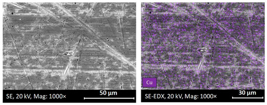 Figure 6 shows the scanning electron microscopy images of the wear track of the disc tested with a 0.4 wt% CuO nanoadditive (left column), supplemented with the Cu locations measured with EDX (right column). The figures in the upper row were taken in the middle point of the wear track, while the lower ones are in the dead center of the ball. Based on the electron microscopy images, it can be established that the wear is minor, and the original surface structure can still be noticed. Abrasion marks visible in the direction of ball movement are the main type of wear. It can be observed on the surface that there are large dark spots and slightly fewer light areas, which are mainly visible in the deeper parts. In the dark areas, overbased calcium sulfonate created the protective layer—already reported by many scientists [7,9]. This phenomenon, according to which the OBCS forms a protective boundary layer on the upper layer of the surface, is related to the results of a study by Topolovec-Miklozic [10].