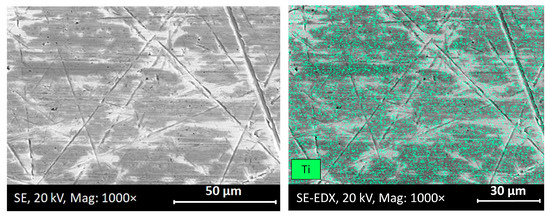 Figure 11 shows the scanning electron microscopy images of the wear track of the disc tested with a 0.4 wt% TiO2 nanoadditive (left column), supplemented with the Ti locations measured with EDX (right column). The figures in the upper row were taken in the middle point of the wear track, while the lower ones are in the dead center of the ball. The results are very similar to the measurements with CuO nanoparticles. Based on the electron microscopy images, it can be established that the wear is minor, and the original surface structure can still be observed. Polishing and abrasion marks visible in the direction of ball movement are the main type of wear. It can be observed on the surface that there are large dark spots and slightly fewer light areas, which are mainly visible in the deeper parts. In the dark areas, overbased calcium sulfonate created the protective layer.