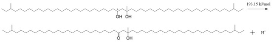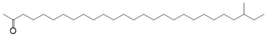 A variety of lubricant oxidation products, such as aliphatic alcohol, aliphatic aldehyde, aliphatic ketone, and aliphatic acid, will be formed during the oxidation of lubricating oils [15,16,17]. There is carbonyl among the aliphatic aldehyde, aliphatic ketone, and aliphatic acid. All of these molecules in which the α-C of carbonyl group contains a hydrogen atom may react to form oxidation products with larger molecular weights through the condensation of the aldol. To simplify the calculation, in this paper, only the aliphatic ketone was selected as the reactant to investigate the mechanism of the acid-catalyzed aldol condensation. The concentration of the base stock, which was a hydrocarbon with 20~40 carbon atoms, is the most commonly found base stock in lubricating oils, and the hydrocarbons in the most-consumed hydrogenated base stock are mainly paraffins [23,24]. Therefore, 2-methyl-2-heptacosanoic ketone was selected as the model aliphatic ketone model, according to the structure of the base stock molecules [23,24]. The structure of aliphatic ketone is shown in Figure 1.