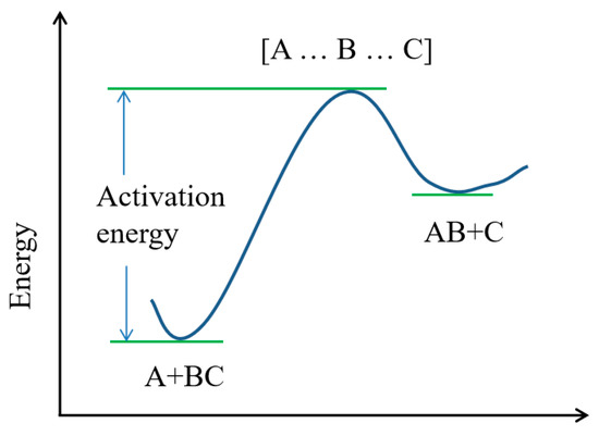 The transition state theory is a theoretical method of studying the mechanism and reaction rate of an elementary reaction. A schematic diagram of the transition state reaction process is shown in Figure 2. For the reaction A + BC→AB + C, transition state theory holds that the actual reaction process is A + BC → [A … B … C] → AB + C. During the reaction, A gradually approaches B in the reactant BC. It has a certain interaction with B and forms a chemical bond A…B, which seems to be weak. At the same time, the original chemical bond between B and C will be gradually weakened and form a seemingly broken chemical bond B … C. The reactants change from two molecules, A and BC, into an unstable [A … B … C], which is the transition state of this reaction. Both reactants and products are in a stable state with low energy, and the transition state is in an unstable state with high energy. The single-point-energy difference between the reactants and the transition state is the activation energy of the reaction.