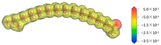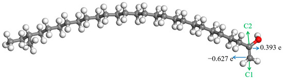 In order to understand the possible reactions and reaction mechanism of aliphatic ketone molecules, it is necessary to have a deep understanding of their properties. Therefore, the deformation charge density of each atom in the aliphatic ketone molecule was calculated, and the result is shown in Figure 3. It can be seen from Figure 3 that the deformation charge density of the alkyl chain in the aliphatic ketone molecule was relatively uniform, while that of the oxygen atom in the carbonyl group was obviously larger, indicating that there was a larger electron density around the oxygen atom. The reason for the heterogeneous distribution of the deformation charge density in the aliphatic ketone molecule lies in the various electronegativities of the atoms in the molecule. The electronegativity of oxygen atoms is distinctly stronger than that of carbon atoms [26]. They have a stronger ability to attract electrons in the C=O bond, which would make the electron density around the oxygen atom higher.