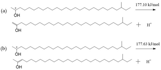 The carbonyl group in the aliphatic ketone contains a C-O π bond, and the electron cloud density in the π bond is low because of the low overlap of the electron orbits forming the π bond. The electron cloud in the C-H bond adjacent to the carbonyl group will partially delocalize to the π bond, which will produce a p–π hyperconjugate effect, thus making the molecule more stable. However, this process will make the stability of the C-H bonds involved in the hyperconjugate effect worse. Because the oxygen atom on the carbonyl group has more negative charges and the hydrogen atom in the C-H bond adjacent to the carbonyl group has some positive charges, there will be a certain electrostatic attraction between them. The ortho-C-H bond of the carbonyl group and the C-O π bond in the carbonyl group will be broken when the molecule absorbs a certain amount of energy. The hydrogen atom in the C-H bond will form an H-O σ bond with the oxygen atom in the carbonyl group, and the carbon atom in the C-H bond will form a C-C π bond with the carbon atom in the carbonyl group. The above process is the conversion of an aliphatic ketone into enol. An enol is the resonance structure of an aliphatic ketone [27]. The hydrogen atom that was captured by the oxygen atom may be bonded with C1 or C3. The activation energies of the above two reaction processes were calculated, and the results are shown in Figure 5. The activation energy of the reaction in which the oxygen atom captured the hydrogen atom bonded with C1 was 269.17 kJ/mol, while that of the reaction in which the oxygen atom captured the hydrogen atom bonded with C3 was 287.82 kJ/mol. This indicates that the oxygen atom in the carbonyl group was captured the hydrogen atom in the shorter alkyl more easily compared with the hydrogen atom in the longer alkyl. The reason for this may be that there are more positive charges in the hydrogen atom bonded with C1 compared with the hydrogen atom bonded with C3 (Figure 4). The attraction between the oxygen atom and the hydrogen atom bonded with C1 is relatively large. However, the activation energies of the above two reactions were both relatively high, which manifested in the conversion of the aliphatic ketone into enol being quite difficult.
