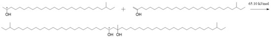 At present, many research studies have been carried out on the oxidation of lubricating oils [14,15,16,17,18,19,20,21]. It was found that a variety of oxidation products containing hydroxyl, carboxyl, or carbonyl groups were formed during the oxidation of lubricating oils through the mechanism of a free radical chain reaction [15,16,17]. The molecular weights of some of the oxidation products were obviously larger than those of the molecules in the original lubricating oils. They might be generated by aldol condensation of carbonyl-containing lubricant oxidation products [22]. However, this was only a theoretical speculation, and there was no in-depth study on the specific reaction process. The research about lubricant oxidation mainly focused on the analysis of the reaction products and the mechanisms of the formation of small-molecule oxidation products. Investigations of the formation of oxidation products with larger molecular weights were limited.