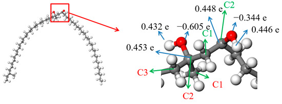 The ESP charges of atoms in the aliphatic ketone molecule were calculated to understand the charges on the atoms more precisely, and the result is shown in Figure 4. Herein, only the atoms in and near the carbonyl group are discussed about due to the uneven distribution of the deformation charge density, which was mainly located in them. Figure 4 shows that there were some negative charges on the oxygen atom in the carbonyl group, while the charge of the carbon atom in the carbonyl group (C2) was positive; they were −0.447 e and 0.579 e, respectively. There were some positive charges on the hydrogen atoms bonded with the neighboring carbon atoms (C1 and C3) of the carbonyl group. The charges of hydrogen atoms bonded with C1 were 0.159–0.171 e, and those of hydrogen atoms bonded with C3 were 0.120–0.128 e.