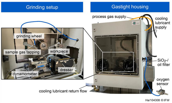 To create an XHV-adequate atmosphere, gastight housing within the Geibel & Hotz (FS840 KT CNC) surface-grinding machine was used. The gas mixture of Argon/Silane was tapped near the contact zone between the grinding tool and the workpiece (Figure 1, left). To validate the XHV-adequate atmosphere, the oxygen partial pressure was measured with an oxygen sensor and recorded using Raspberry Pi. (Figure 1, right). A preset filter at the sensor prevented oil and SiO2 particles from entering the oxygen sensor. How the XHV-adequate atmosphere was established in detail is shown in chapter 3.1.