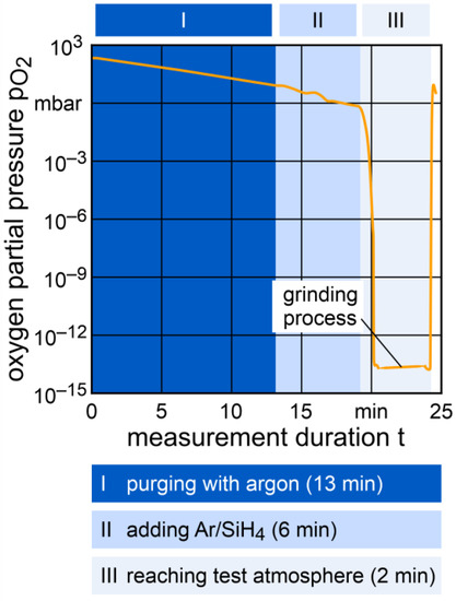 This reaction chain leads to the formation of hydrogen and silicon dioxide [13]. Using these reactions generates an atmosphere with a very low oxygen partial pressure, pO2, of ≤10 20 mbar at ambient air pressure [14]. Concerning the oxygen content, the resulting atmosphere is equivalent to an extremely high vacuum (XHV), which starts at 10−12 mbar [15]. The advantage of this approach is that it is much less complex than is that of using a conventional technical vacuum.