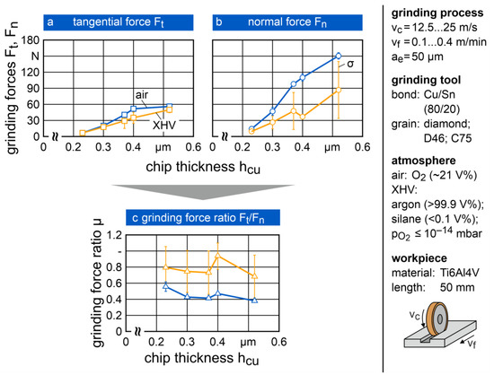 An increasing linear correlation between grinding force directions and chip thickness could be observed. With an increasing single-grain chip thickness, the mechanical load also increased. The main reasons were the decreasing cutting speeds and increasing feed rates that caused a rise in chip thickness, according to FRIEMUTH [16]. The performed experiments showed a significant difference in grinding forces between grinding in air and XHV (Figure 3a,b). The absolute force values during grinding in XHV were 16% (Ft) and 50% (Fn) lower on average.