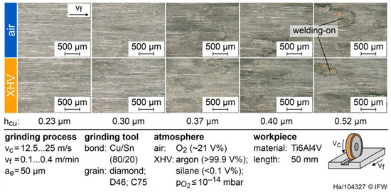 Microscope images of the ground workpieces were taken to analyze the workpiece surface. In Figure 4, the resulting surfaces of grinding processes in air and XHV for different chip thicknesses, hcu, are compared. An increasing chip thickness changes the surface towards a more pronounced welding-on of titanium chips (workpiece) and of bronze bond (grinding tool). These welding-on effects first appear at hcu = 0.37 µm and intensify with increasing chip thickness. Visible dark surface discoloration starts at hcu = 0.37 µm, indicating a distinct temperature-induced grinding burn. However, these effects are comparable between grinding in air and an XHV.