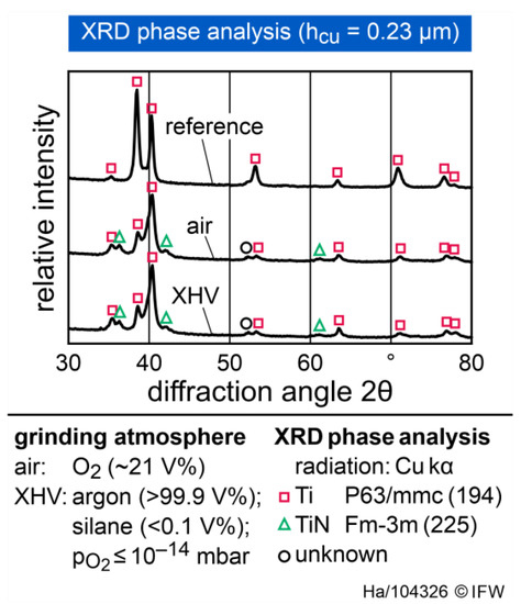 To further analyze the titanium surface, an XRD phase analysis was performed. No quantitative differences in peak intensities and positions were found between the different process parameter sets. For this reason, a representative sample that was ground with a chip thickness of hcu = 0.23 µm is shown in Figure 6. The reference measurement of the workpiece before grinding shows that only titanium was present on the surface. After grinding, additional peaks appeared to be identical in position and intensity for the two machining atmospheres (air/XHV). These peaks mainly represent titanium nitride (TiN) formed on the surfaces in both atmospheres [21]. Since only oxygen was removed from the gastight housing, some residual nitrogen content was likely still present in the XHV-adequate atmosphere. During grinding, the nitrogen reacted with the newly formed titanium surface due to the elevated grinding temperatures, resulting in the formation of a titanium nitride layer. An oxide layer could not be detected during grinding since the XRD measurement method is unsuitable for detecting very thin layers.